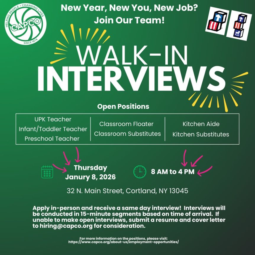 CAPCO is hosting a hiring event on Thursday, January 8, 2025, from 8am to 4pm for multiple positions for our Early Childhood Development Program in Cortland County! Come in, apply in-person and receive a same day interview!